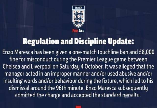 禁赛、罚款!切尔西遭重击,没有主帅或许更妙,马雷斯卡承认现实该来的躲不掉,切尔西这回摊上大事了。英足总敲锤宣布:马雷斯卡吃到禁赛,还得搭上8000英镑的罚款票子。这两周蓝军球迷脑袋都炸了,红牌跟下雨似的,一场接一场砸下来。利物浦那夜,第96分钟还没过去呢,就出状况。埃斯特旺补时绝杀后,全队沸腾,边线...